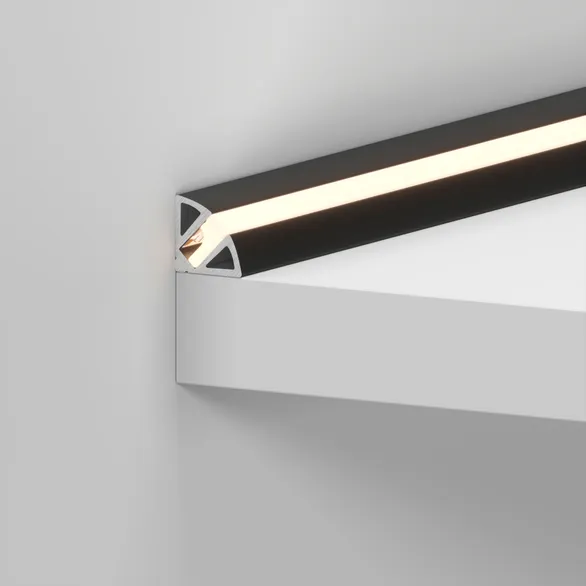Накладной угловой профиль черного цвета из анодированного алюминия для подсветки мебели, пазов, ниш и других элементов интерьера. Габаритные размеры профиля составляют 2000 мм в длину, 11 мм в ширину и 11 мм в высоту. Площадка для установки светодиодных лент позволяет использовать ленту шириной до 5,2 мм и мощностью до 15 Вт/м. Это обеспечивает гибкость в выборе светодиодных лент и создает потрясающие световые решения.