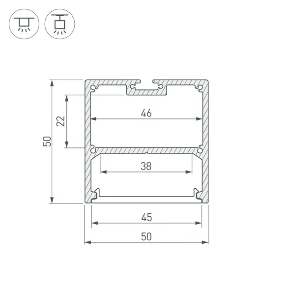 Подвесной/накладной профиль из анодированного алюминия для основной и контурной подсветки помещений. Габаритные размеры профиля составляют 3000 мм в длину, 50 мм в ширину и 50 мм в высоту. Площадка для установки светодиодных лент позволяет использовать ленту шириной до 38 мм и мощностью до 52,5 Вт/м. Это обеспечивает гибкость в выборе светодиодных лент и создает потрясающие световые решения.