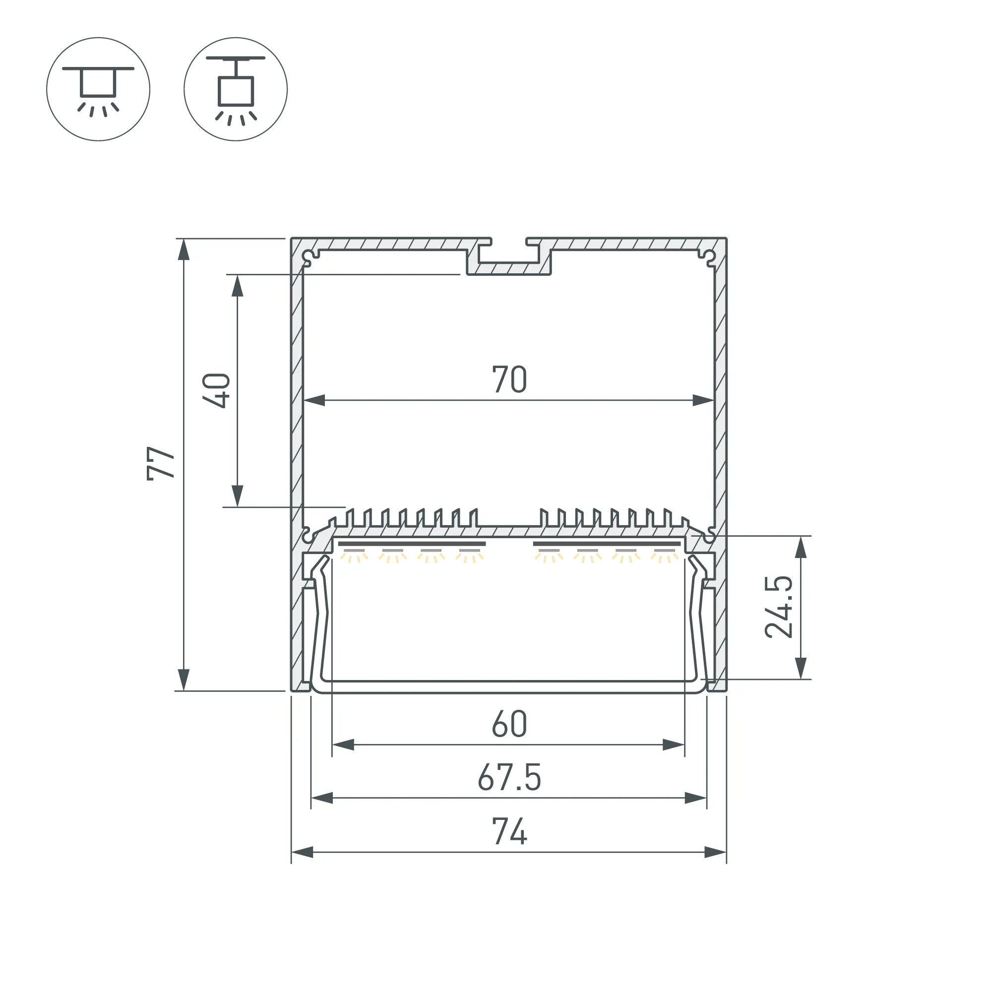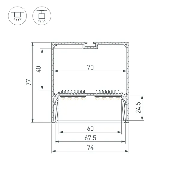 Подвесной/накладной профиль из анодированного алюминия для основной и контурной подсветки помещений. Габаритные размеры профиля составляют 2000 мм в длину, 74 мм в ширину и 77 мм в высоту. Площадка для установки светодиодных лент позволяет использовать ленту шириной до 60 мм и мощностью до 79,2 Вт/м. Это обеспечивает гибкость в выборе светодиодных лент и создает потрясающие световые решения. Монтаж осуществляется накладным либо подвесным способом.