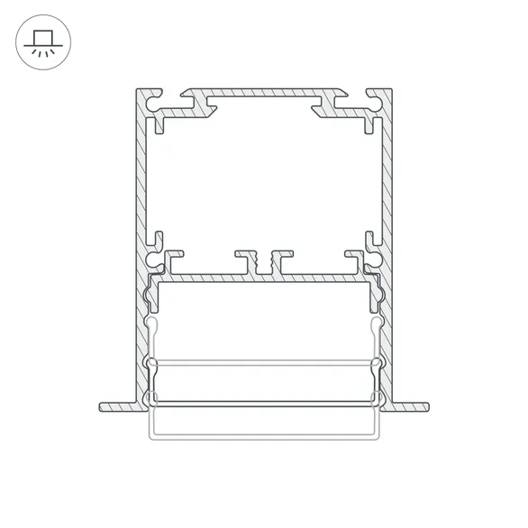 Встраиваемый профиль с накладным фланцем из анодированного алюминия для основного освещения и контурной подсветки. Возможность установки экрана на трех уровнях: выступая за края профиля, вровень с профилем и утоплено, позволяет получить разные световые эффекты.