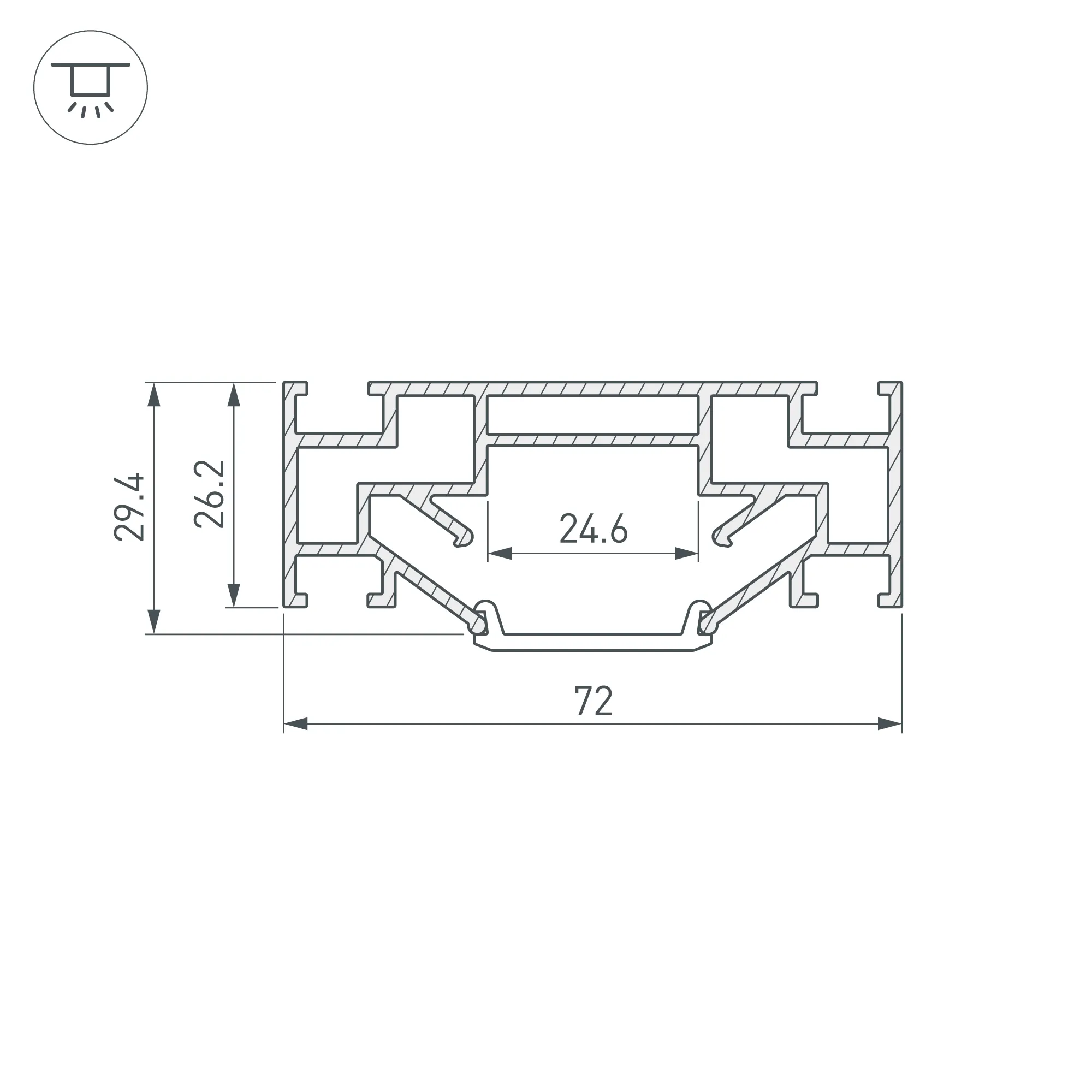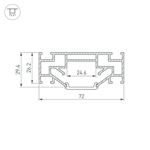 Габаритные размеры профиля составляют 2000 мм в длину, 72 мм в ширину и 29,4 мм в высоту. Площадка для установки светодиодных лент позволяет использовать ленту шириной до 24,6 мм и мощностью до 53 Вт/м. Это обеспечивает гибкость в выборе светодиодных лент и создает потрясающие световые решения.