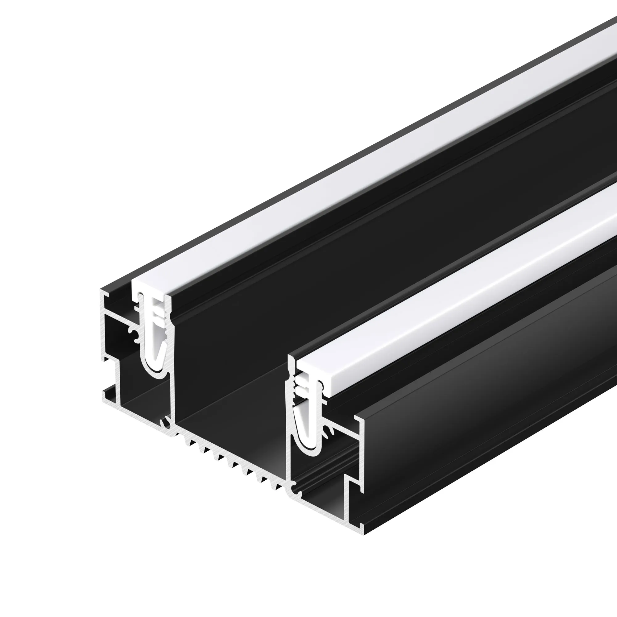 Встраиваемый алюминиевый профиль черного цвета (центральная линия) для дизайнерских решений «линии света» в натяжных потолках. Решение 2-в-1: служит каркасом для крепления натяжного потолка и профилем для установки светодиодной ленты. Подходит для тканевых и ПВХ потолков.