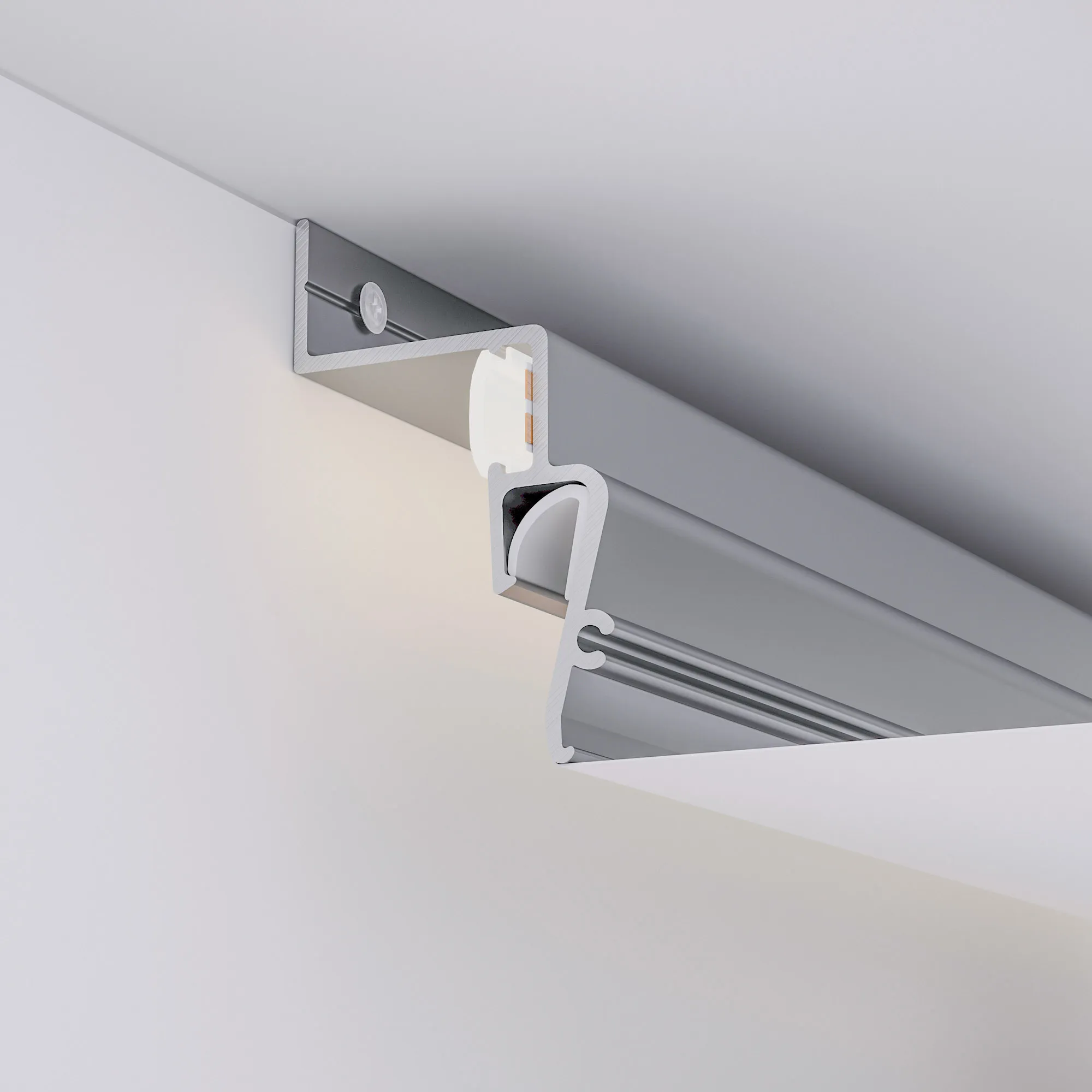 Накладной алюминиевый профиль белого цвета для установки натяжных потолков и контурной подсветки с эффектом парящего потолка. Решение 2-в-1: служит каркасом для крепления натяжного потолка с использованием гарпунной системы и профилем для установки светодиодной ленты.