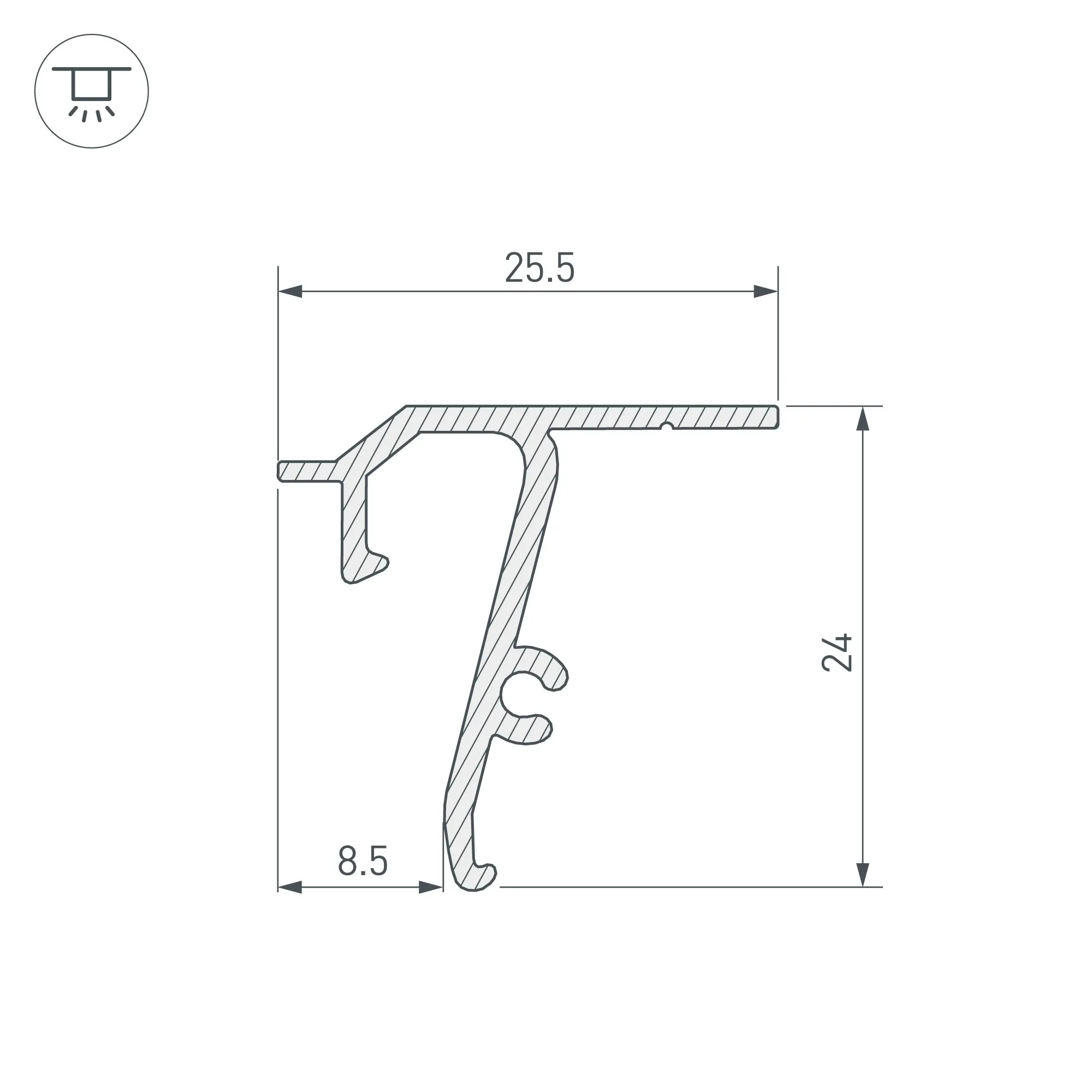 Габаритные размеры профиля составляют 2000 мм в длину, 25,5 мм в ширину и 24 мм в высоту.