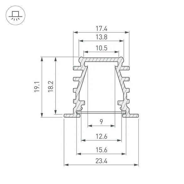 Габаритные размеры профиля составляют 2000 мм в длину, 23,4 мм в ширину и 19,1 мм в высоту. Площадка для установки светодиодных лент позволяет использовать ленту шириной до 9 мм и мощностью до 20,1 Вт/м. Это обеспечивает гибкость в выборе светодиодных лент и создает потрясающие световые решения.