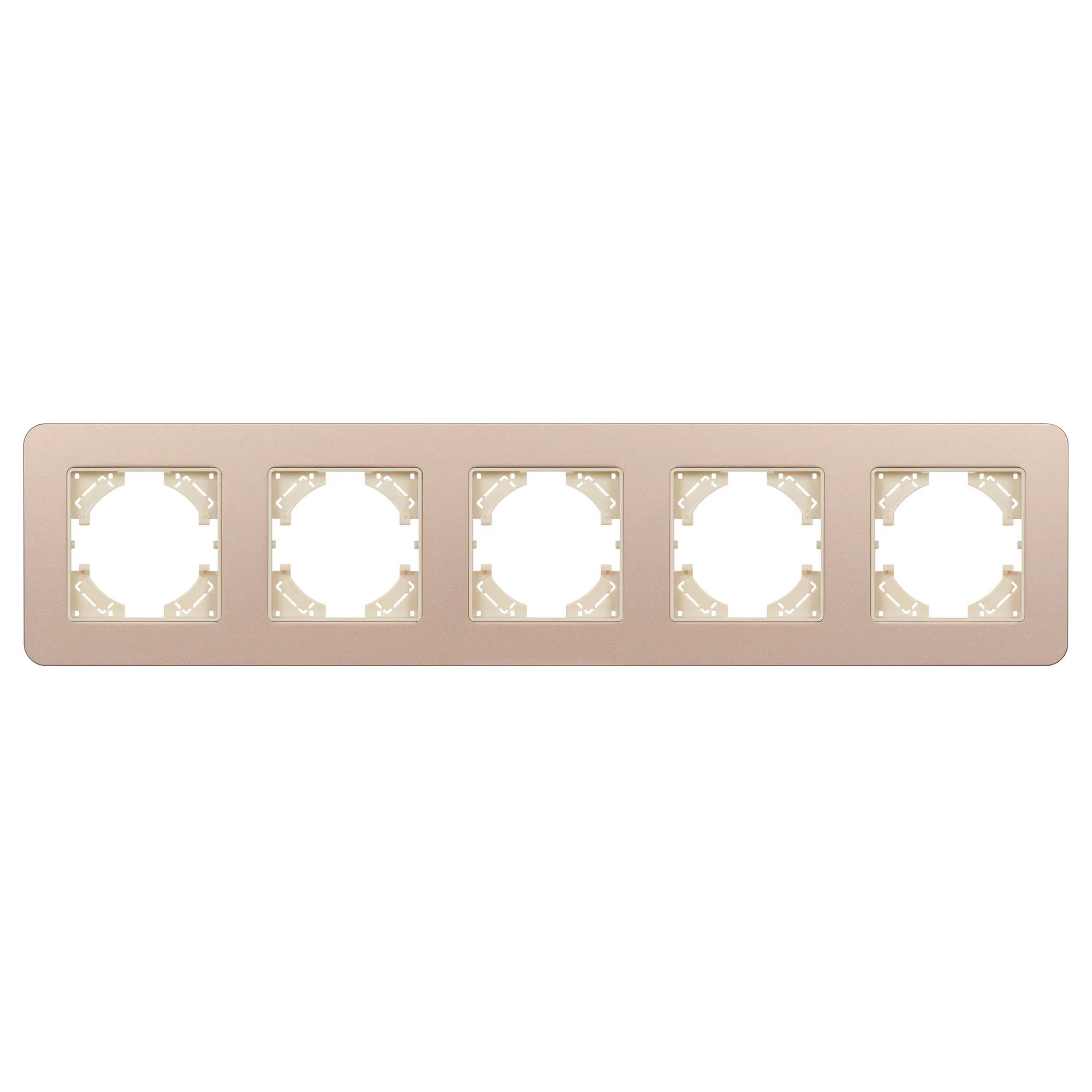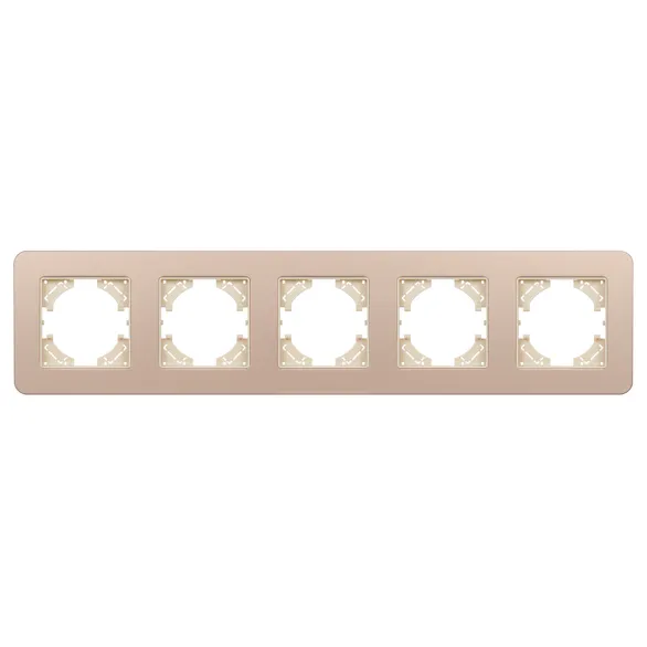 Рамка алюминиевая на 5 постов, под встраиваемый механизм. Цвет - золотой с Soft-Touch покрытием. Среднего уровня герметичности IP20. Ориентация монтажа - горизонтальная (основным ориентиром служат посадочные выступы для накладки механизма).