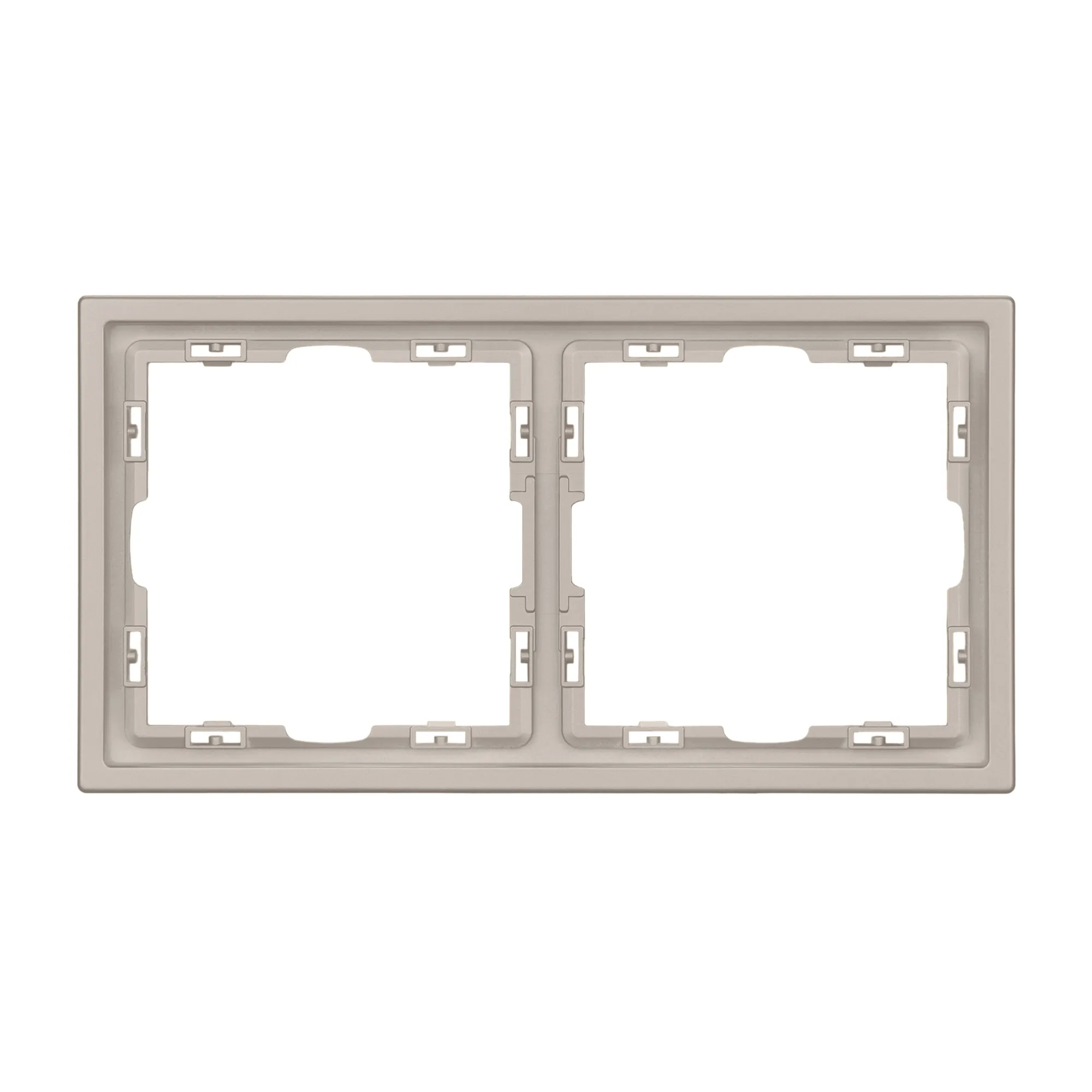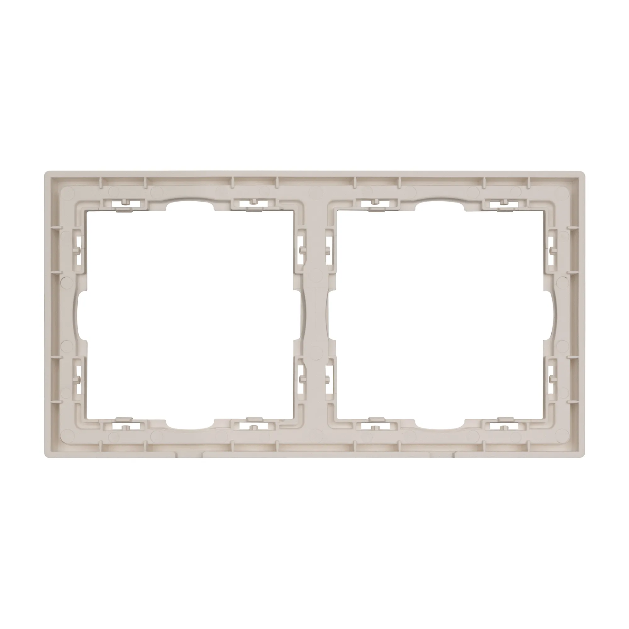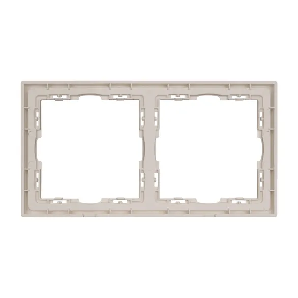 Рамка пластиковая на 2 поста, под встраиваемый механизм. Цвет - кашемир, с Soft-Touch поверхностью. Среднего уровня герметичности IP20. Ориентация монтажа горизонтальная.