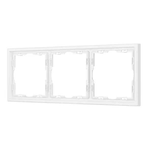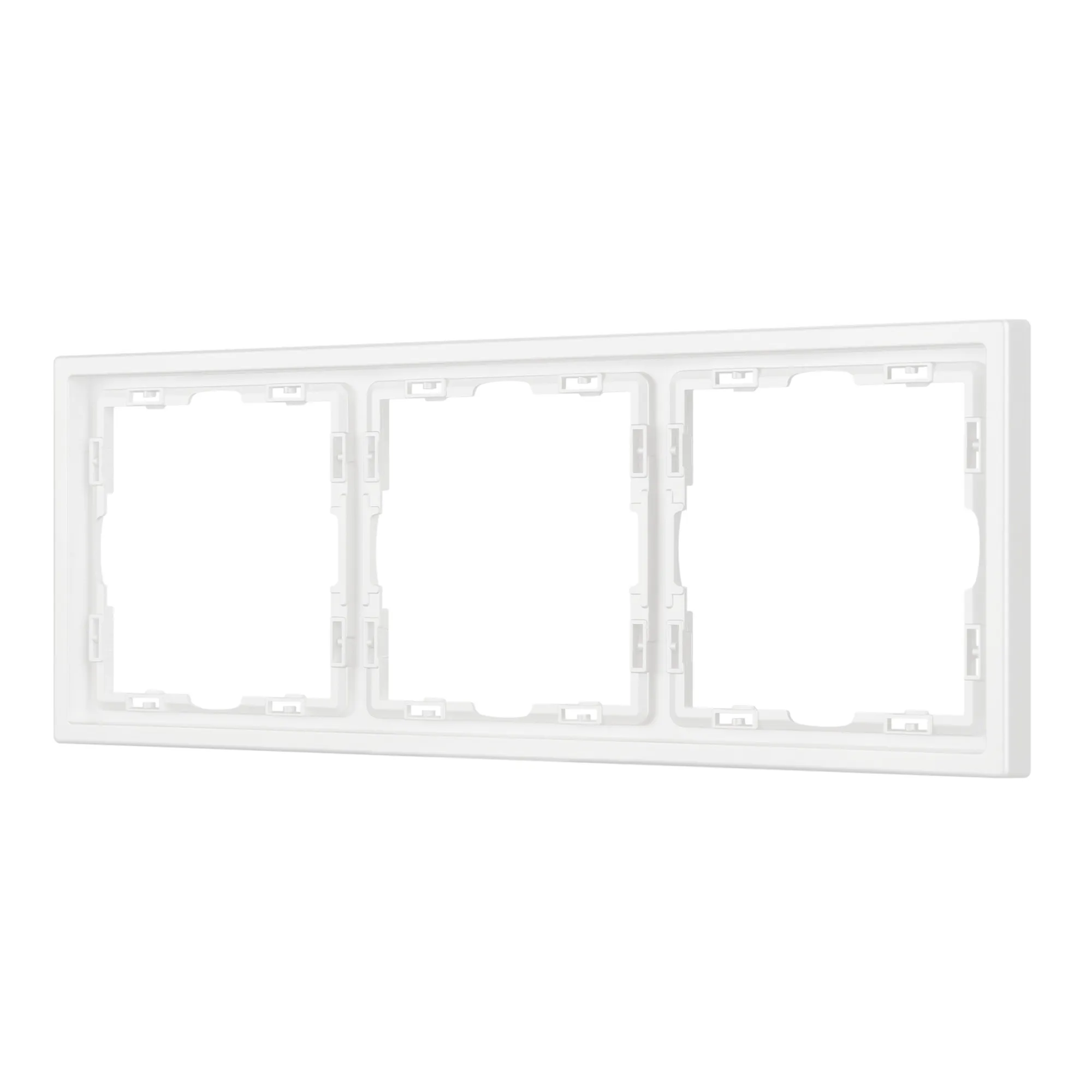 Рамка пластиковая на 3 поста, под встраиваемый механизм. Цвет - белый, с Soft-Touch покрытием. Среднего уровня герметичности IP20. Ориентация монтажа горизонтальная.