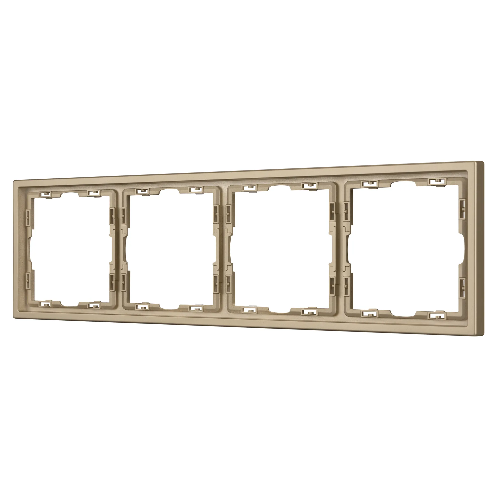 Рамка пластиковая на 4 поста, под встраиваемый механизм. Цвет - золотой, с Soft-Touch покрытием. Среднего уровня герметичности IP20. Ориентация монтажа горизонтальная.