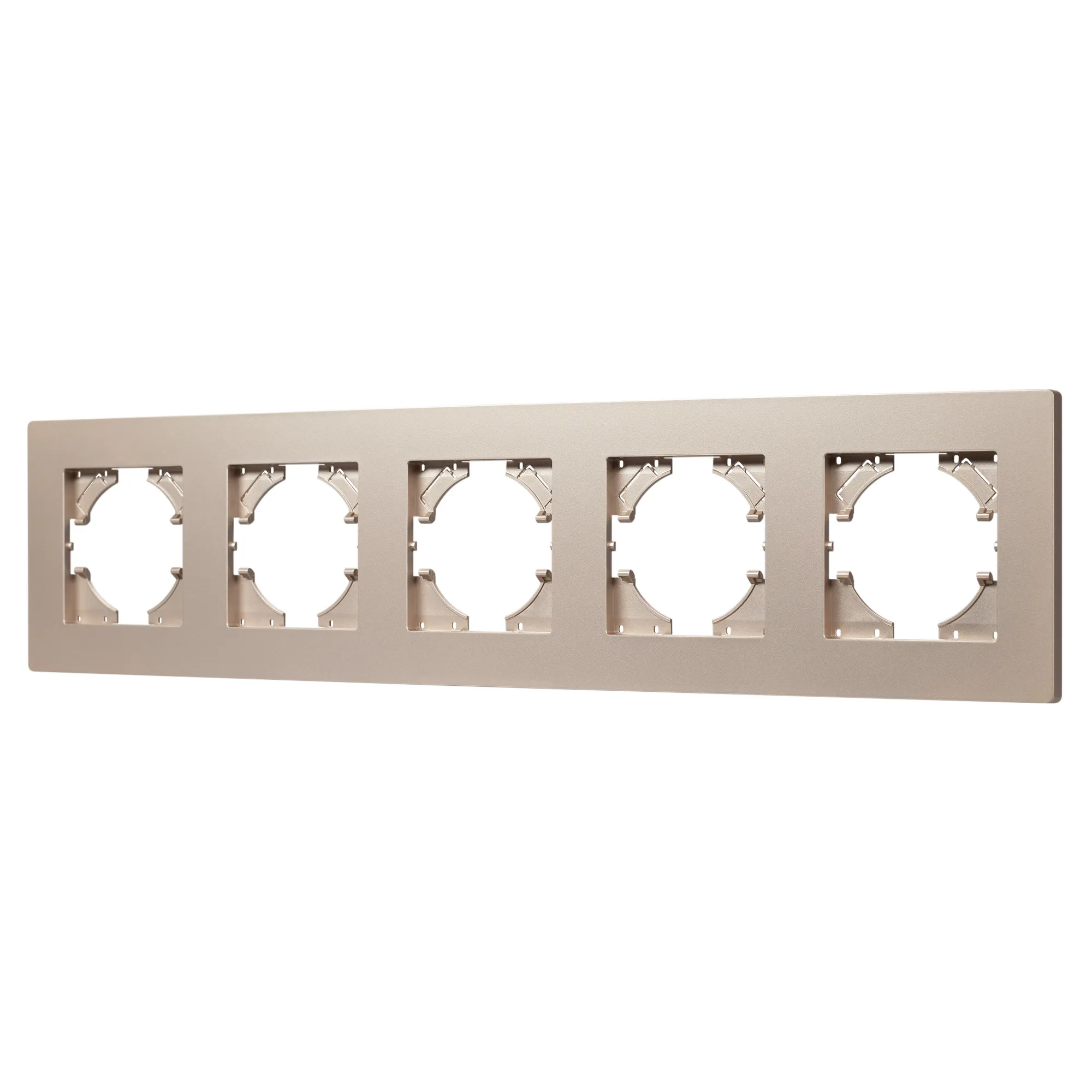 Рамка пластиковая на 5 постов, под встраиваемый механизм. Цвет - золотой. Среднего уровня герметичности IP20. Ориентация монтажа - горизонтальная (основным ориентиром служат посадочные выступы для накладки механизма).