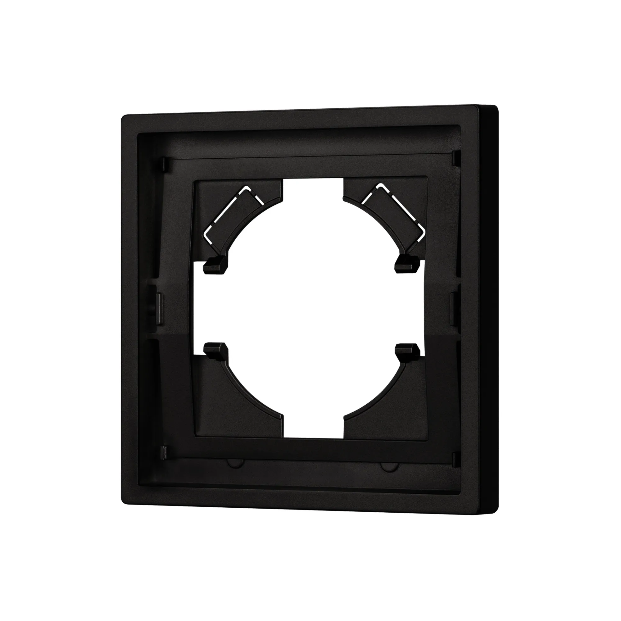 Корпус рамки выполнен в черном цвете и имеет покрытие Soft-Touch, что придает изделию приятные тактильные свойства. Высота рамки составляет 9 мм, что позволяет эффективно интегрировать рамку в интерьерные решения любого уровня сложности.