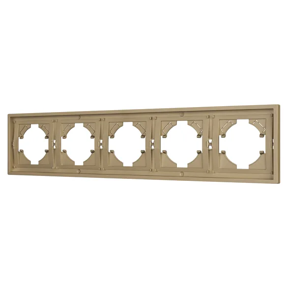 Рамка пластиковая на 5 постов, под встраиваемый механизм. Цвет - золотой, с Soft-Touch покрытием. Среднего уровня герметичности IP20. Ориентация монтажа горизонтальная.