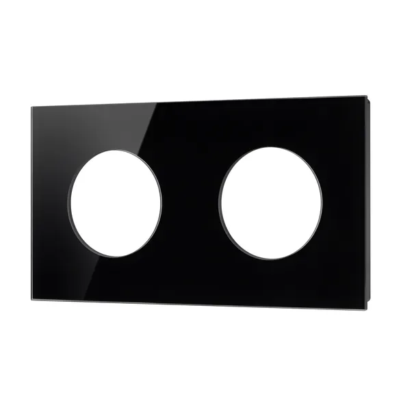 Рамка стеклянная на 2 поста, под встраиваемый механизм. Вырез под функциональную часть круг. Цвет - черный. Ориентации монтажа - горизонтальная.