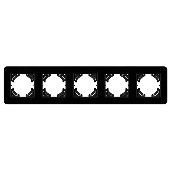 Рамка стеклянная на 5 постов, под встраиваемый механизм. Цвет - черный. Среднего уровня герметичности IP20. Ориентация монтажа - горизонтальная (основным ориентиром служат посадочные выступы для накладки механизма).