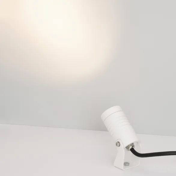 Уличный светодиодный прожектор, мощность 5Вт, угол освещения 25°. Цвет ДНЕВНОЙ 4000К, световой поток 310лм. Влагозащищенный корпус IP67 - белый алюминий, экран из закалённого стекла. Угол поворота корпуса в вертикальной плоскости 135°. Питание 230В, мощность 5 Вт. Размеры DxH -Ø42х77мм. В комплекте 1м провод.