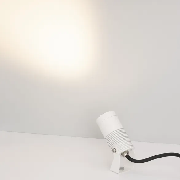 Уличный светодиодный прожектор, мощность 8Вт, угол освещения 33°. Цвет ДНЕВНОЙ 4000К, световой поток 610лм. Влагозащищенный корпус IP67 - белый алюминий, экран из закалённого стекла. Угол поворота корпуса в вертикальной плоскости 135°. Питание 230В, мощность 8 Вт. Размеры DxH -Ø44х90мм. В комплекте 1м провод.