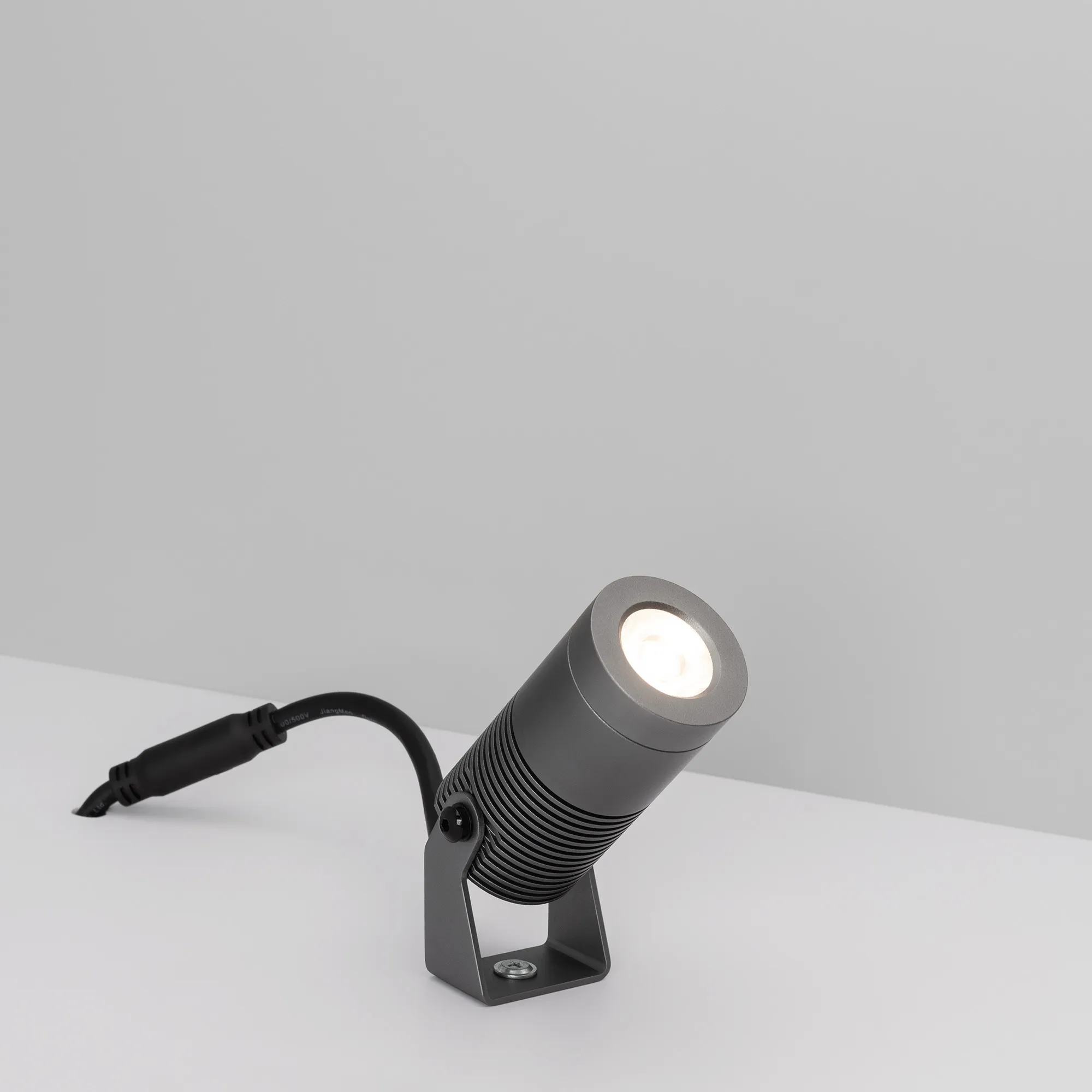 Уличный светодиодный прожектор ALT-RAY-R44-8W Warm2700 (DG, 33 deg, 230V) мощностью 8 Вт теплого цвета свечения (3000 К) предназначен для организации локального освещения элементов фасадов зданий и сооружений, малых архитектурных форм, деревьев и зеленых насаждений. Поворотная конструкция корпуса позволяет мгновенно регулировать направление света в вертикальной плоскости в диапазоне 135°. Узкий угол излучения 33° и световой поток 580 лм дает возможность решать задачу точечного освещения объектов. Ударопрочный корпус Ø44хН90 мм темно-серого цвета выполнен из алюминия с устойчивым анодно-оксидным покрытием. Оптический блок закрыт прочным экраном из закаленного стекла толщиной 3мм. Степень пылевлагозащиты светильника IP67 рассчитана на длительное использование на открытом воздухе, обеспечивая надежную работу в неблагоприятных условиях. Встроенный драйвер позволяет безопасно и быстро подключить светильник к сети 230В, а для удобства монтажа в комплект входит провод длиной 1м. Возможна установка в грунт или на поверхность при помощи дополнительных аксессуаров — основания-пики или круглого основания (приобретаются отдельно).