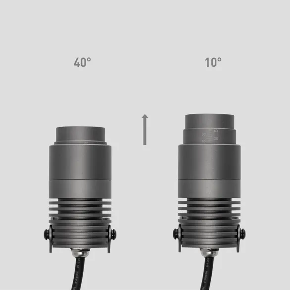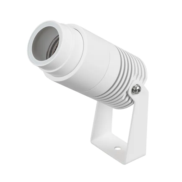 Уличный светодиодный прожектор, мощность 8Вт, регулируемый угол освещения 10-40°. Цвет ТЕПЛЫЙ 3000К, световой поток для угла 10° 240 для угла 40° 420лм. Влагозащищенный корпус IP67 - белый алюминий, экран из закаленного стекла. Угол поворота корпуса в вертикальной плоскости 135°. Питание 230В, мощность 8 Вт. Размеры DxH - Ø52x103мм. В комплекте 1м провод.