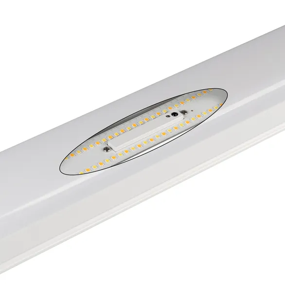 Накладной светильник 28 Вт. со встроенным микроволновым датчиком движения. Цвет БЕЛЫЙ ДНЕВНОЙ 4000K, св.поток 3680лм, CRI(Ra)>80, угол свечения 120°. Корпус прямоугольный, белый пластик, влагозащищенный IP65. Ударопрочность IK05. Размер LxWxH 1200x62x57мм. Питание AC 220-240В, 28 Вт, драйвер встроенный. Максимальная мощность для подключения в линию 400 Вт. Крепеж для накладного монтажа в комплекте.