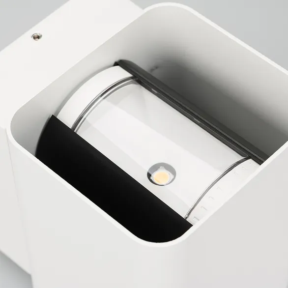 Уличный светодиодный светильник для стен, изменяемый угол освещения 0°-80°, свет вверх-вниз на 2 стороны. Цвет ТЕПЛЫЙ БЕЛЫЙ 3000К, светодиоды 2x6Вт CREE (750 лм). Влагозащищенный корпус IP54 - белый (RAL9003) алюминий, экран ударопрочный PC. Питание 230В, мощность 12 Вт. Размеры ВхШхГ -138х104х129 мм.