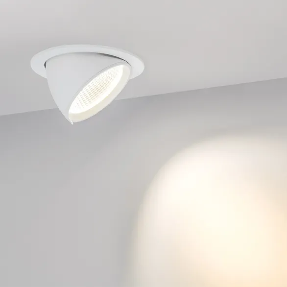Встраиваемый поворотно-выдвижной светильник. Мощность 30 Вт, св. поток 2500 лм, 73-84 лм/Вт, дневной 4000 K, CRI>90, угол 38°, напряжение питания 230 В. Белый круглый корпус из алюминия, экран стекло, степень защиты IP20. Угол поворота 350°, угол наклона 45°. Размер: диаметр 148 мм, высота 140 мм. Монтаж встраиваемый, установочное отверстие: диаметр 140 мм. Драйвер 25,5-43 В, 700 мА, пульсация <3%.