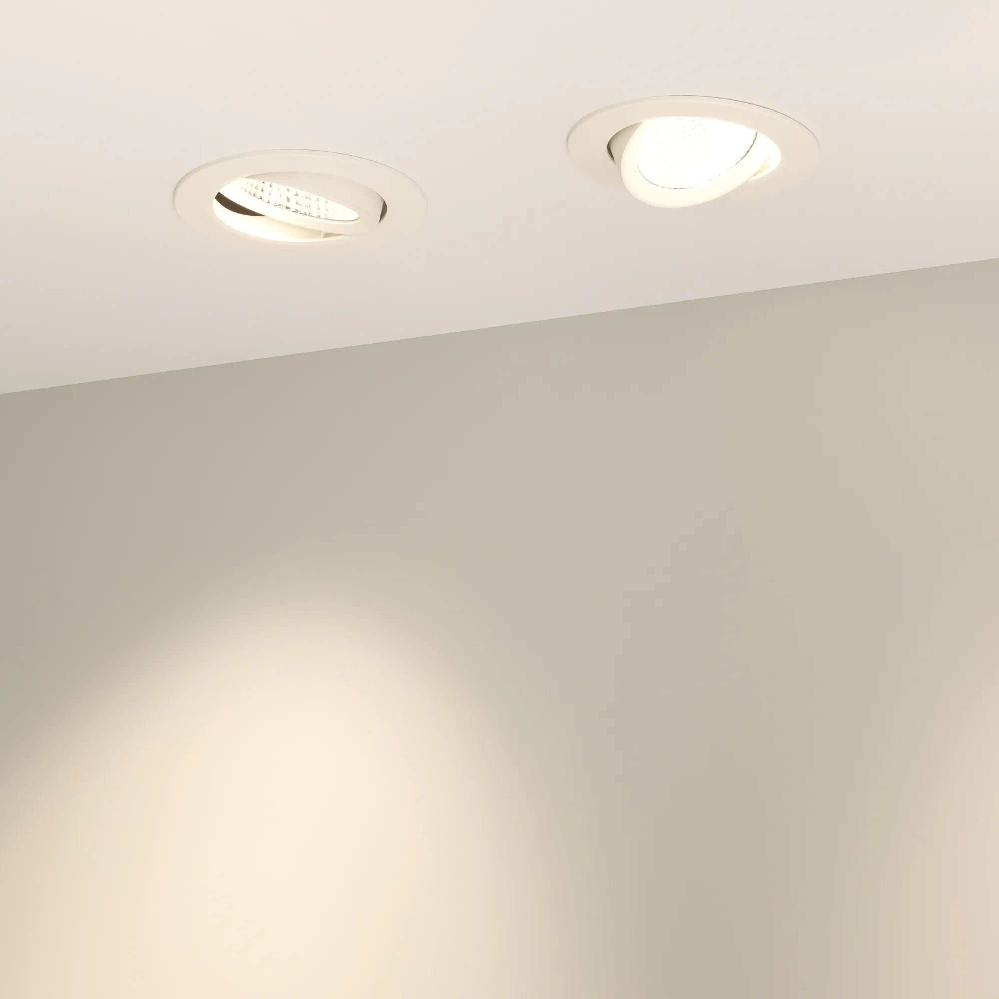 Встраиваемый поворотный светильник LTD-POLAR-TURN-R105-10W Warm3000 (WH, 36 deg, 230V) мощностью 10 Вт, с теплым цветом свечения (3000 К) и низким коэффициентом дискомфорта UGR<19, благодаря чему достигается комфортный индекс освещенности. Светильник с цветопередачей CRI>80, световым потоком 900 лм и узким углом излучения 36° предназначен для направленного освещения торговых, офисных, жилых и других помещений. Световой модуль может отклоняться на 30°, позволяя мгновенно менять направление света. Светильник легко устанавливается с помощью пружин в монтажное отверстие Ø 83-95 мм. Благодаря встроенному драйверу светильник безопасно и быстро подключается напрямую к сети переменного тока 230 В.