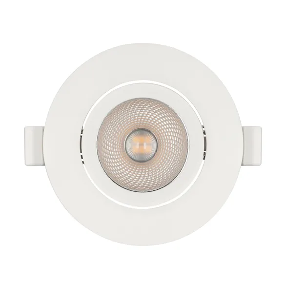 Встраиваемый поворотный светильник "даунлайт". Мощность 6.5 Вт, св. поток 550 лм, 85 лм/Вт, теплый 3000 K, CRI>80, UGR<19, угол 36°, напряжение питания 230 В. Белый круглый корпус из теплопроводящего полиамида, степень защиты IP20, угол поворота оси 30°. Размер: диаметр 90 мм, высота 43 мм. Монтаж встраиваемый, установочное отверстие диаметр 68-80 мм. Пульсация <2%.