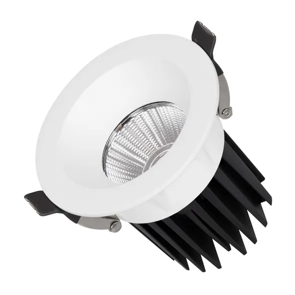 Встраиваемый светильник даунлайт. Мощность 10 Вт, св. поток 910 лм, 90 лм/Вт, дневной 4000 K, CRI>90, угол 36°, напряжение питания 230 В. Белый круглый корпус из алюминия, экран PMMA, степень защиты IP54. Размер: диаметр 86 мм, высота 80 мм. Монтаж встраиваемый, установочное отверстие: диаметр 80 мм. Драйвер IP54, 20-40 В, 250 мА, пульсация <1%.