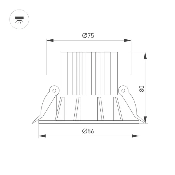 Встраиваемый светильник даунлайт. Мощность 10 Вт, св. поток 750 лм, 75 лм/Вт, тёплый 3000 K, CRI>90, угол 36°, напряжение питания 230 В. Чёрный круглый корпус из алюминия, экран PMMA, степень защиты IP54. Размер: диаметр 86 мм, высота 80 мм. Монтаж встраиваемый, установочное отверстие: диаметр 80 мм. Драйвер IP54, 20-40 В, 250 мА, пульсация <1%.