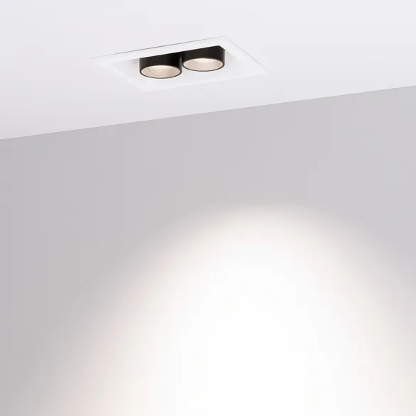 Встраиваемый поворотный светильник. Мощность 5 Вт, св. поток 375 лм, 75 лм/Вт, дневной 4000 K, CRI>98, угол 30°, напряжение питания 230 В. Чёрный прямоугольный корпус из алюминия, экран PMMA, степень защиты IP20. Размер: длина 90 мм, ширина 67 мм, высота 50 мм. Монтаж встраиваемый, установочное отверстие длина 85 мм, ширина 60 мм. Драйвер 3-9 В, 700 мА, пульсация <1%.