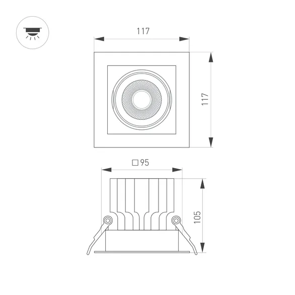 Встраиваемый карданный светильник. Мощность 20 Вт, св. поток 2132 лм, 107 лм/Вт, дневной 4000 K, CRI>92, угол 40°, напряжение питания 230 В. Белый корпус из алюминия, белая вставка, степень защиты IP20. Размер: длина 117 мм, ширина 117 мм, высота 105 мм. Монтаж встраиваемый, установочное отверстие: длина 95 мм, ширина 95 мм. Драйвер 24-42 В, 500 мА, пульсация <2%.