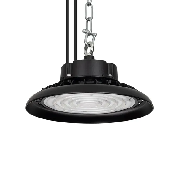 Светильник для освещения складских и промышленных помещений. Мощность 100W, напряжение питания AC 120-270V/50Hz. CRI 80. Тип светодиодов SMD2835, с групповой оптической линзой. Цвет свечения ДНЕВНОЙ 5000K, световой поток 15000 Lm, угол рассеивания 90°. Доступно управление по протоколу 0-10В. Цвет корпуса черный, линза из поликарбоната, степень влагозащиты IP65, ударопрочность IK08. Габариты Ф260xH140мм. Рым-болт в комплекте. Длина кабеля питания 900 мм, кабеля 0-10 200мм.