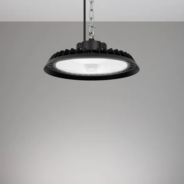 Светильник для освещения складских и промышленных помещений. Мощность 200W, напряжение питания AC 120-270V/50Hz. CRI 80. Тип светодиодов SMD2835, с групповой оптической линзой. Цвет свечения ДНЕВНОЙ 5000K, световой поток 30000 Lm, угол рассеивания 60°. Доступно управление по протоколу 0-10В. Цвет корпуса черный, линза из поликарбоната, степень влагозащиты IP65, ударопрочность IK08. Габариты Ф350xH140мм. Рым-болт в комплекте. Датчик настраивается с помощью пульта 052018 (один на все датчики). Длина кабеля питания 900 мм, кабеля 0-10 200мм.