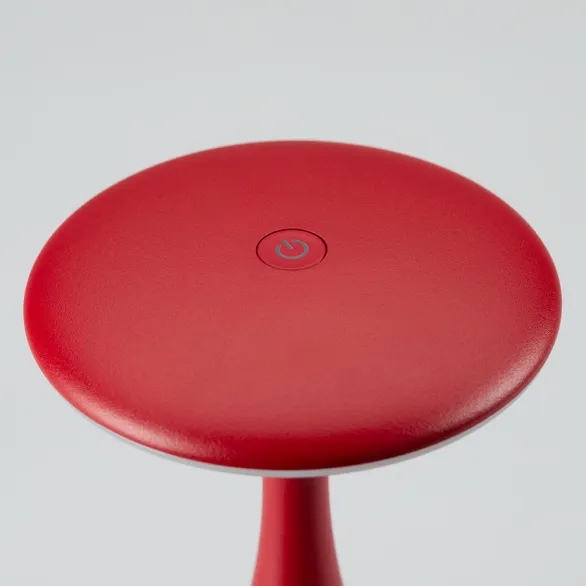 Настольный светильник со встроенным аккумулятором 1.5Вт, красный алюминиевый корпус. Цвет ТЕПЛЫЙ БЕЛЫЙ 2200-3000K, св.поток 110лм, CRI(Ra)>80, угол 123°. Размер Ф101x197мм. IP54. Зарядка от сети переменного тока AC220-240V. Тип встроенного аккумулятора 2600мАч Li-ion, напряжение батареи 3.7V.