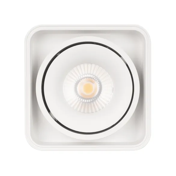 Накладной интерьерный светильник. Мощность 8 Вт, св. поток 760 лм, 98 лм/Вт, дневной 4000 K, CRI>90, угол 45°, регулируемое направление луча 30°, напряжение питания 230 В. Белый квадратный корпус из алюминия, степень защиты IP20. Размер: длина 100 мм, ширина 100 мм, высота 100 мм. Монтаж накладной. Драйвер 24-42 В, 200 мА, пульсация <1%.