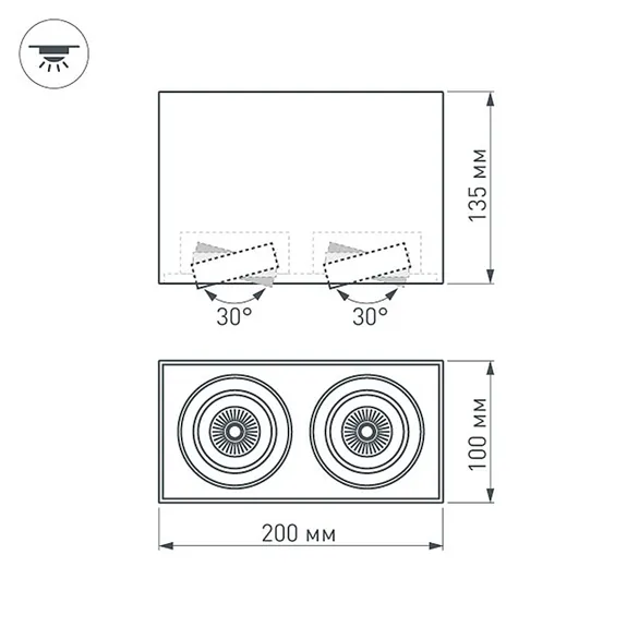 Накладной интерьерный светильник. Мощность 2x11 Вт, св. поток 1660 лм, 75 лм/Вт, теплый 3000 K, CRI>90, угол 40°, регулируемое направление луча 30°, напряжение питания 230 В. Белый квадратный корпус из алюминия, степень защиты IP20. Размер: длина 100 мм, ширина 200 мм, высота 135 мм. Монтаж накладной. Драйвер 18-24 В, 500 мА (2 штуки), пульсация <5%.