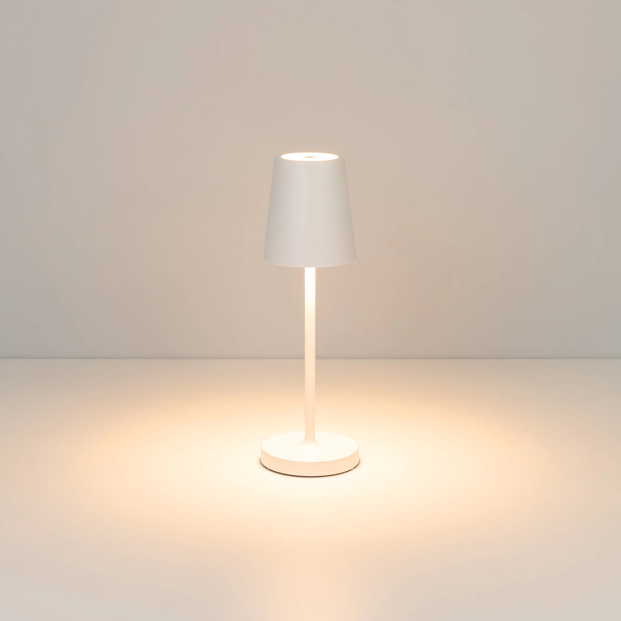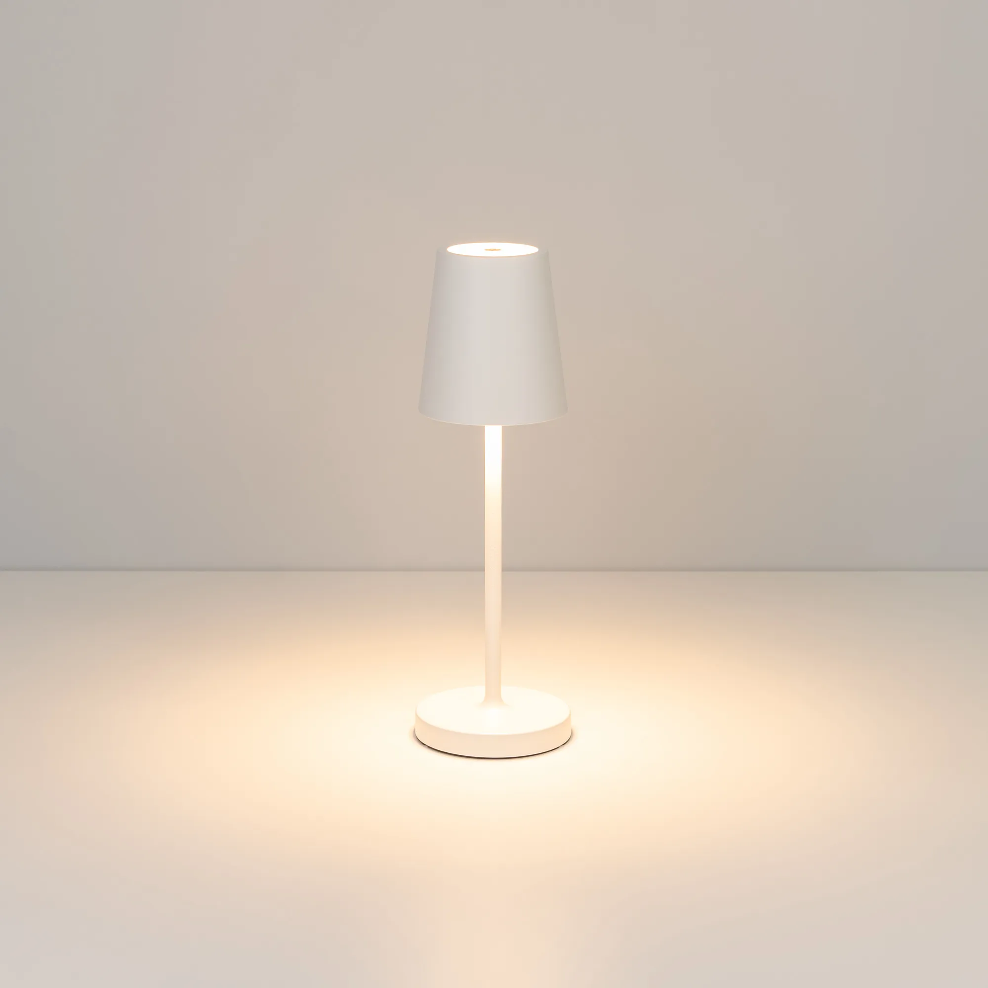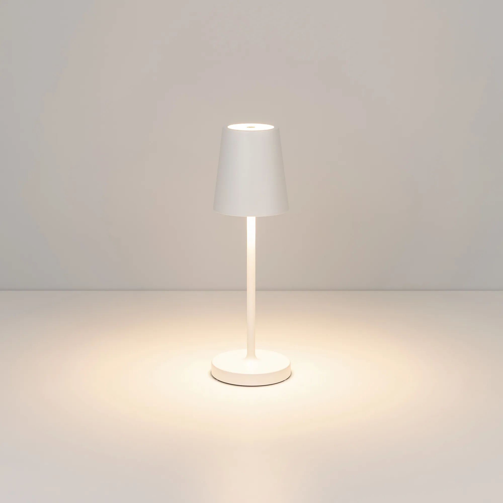 Настольный светильник со встроенным аккумулятором 1.5Вт, алюминиевый корпус, цвет белый. Цвет ТЕПЛЫЙ БЕЛЫЙ 2200-2700-3000K, св.поток 110-130 лм, CRI(Ra)>80, угол 90°. Размер Ф75x250мм. IP54. Зарядка от сети переменного тока AC220-240V. Тип встроенного аккумулятора 1500мАч Li-ion, напряжение батареи 3.7V.