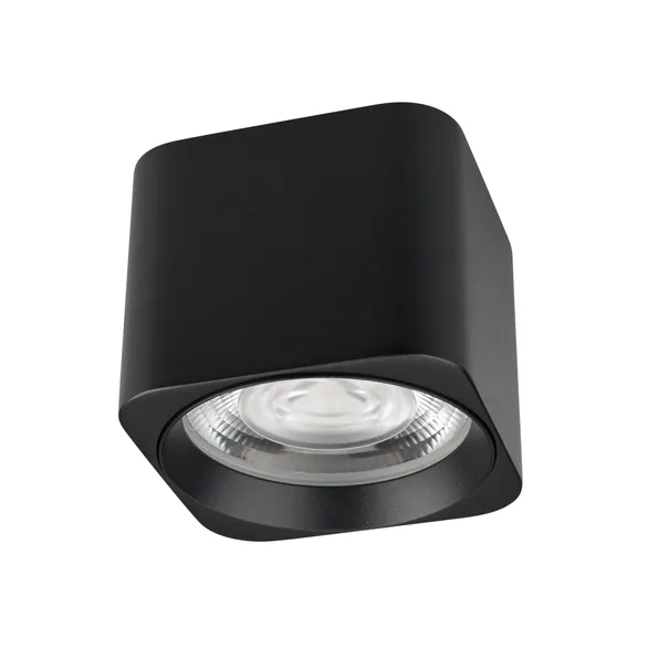 Накладной интерьерный светильник. Мощность 10 Вт, св. поток 780 лм, 78 лм/Вт, теплый 3000 K, CRI>90, угол 24°, напряжение питания 230 В. Черный квадратный корпус из алюминия, степень защиты IP54. Размер: длина 78 мм, ширина 78 мм, высота 65 мм. Монтаж накладной. Драйвер встроенный, пульсация <5%.