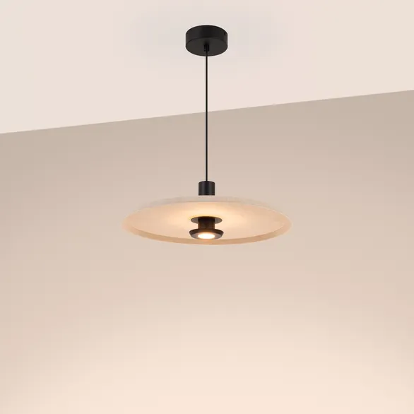 Подвесной светильник. Мощность 12 Вт, св. поток 648 лм, 54 лм/Вт, теплый 2700 K, CRI>94, угол 36°, напряжение питания 230 В. Бежевый фигурный плафон из переработанного фетра с кофейной внутренней поверхностью, линза-рассеиватель из PMMA, степень защиты IP20. Размер: диаметр 450 мм, высота 145 мм. Монтаж подвесной, длина подвеса 2000 мм, регулируемая. В комплекте 2 вида чаш. Габариты чаши (встраиваемая) Ø80 х 23 мм, врезное отверстие Ø60 мм. Габариты чаши (накладная) Ø120 x 35 мм. Драйвер 59В, 300 мА, пульсация <1%. Управление по TRIAC.