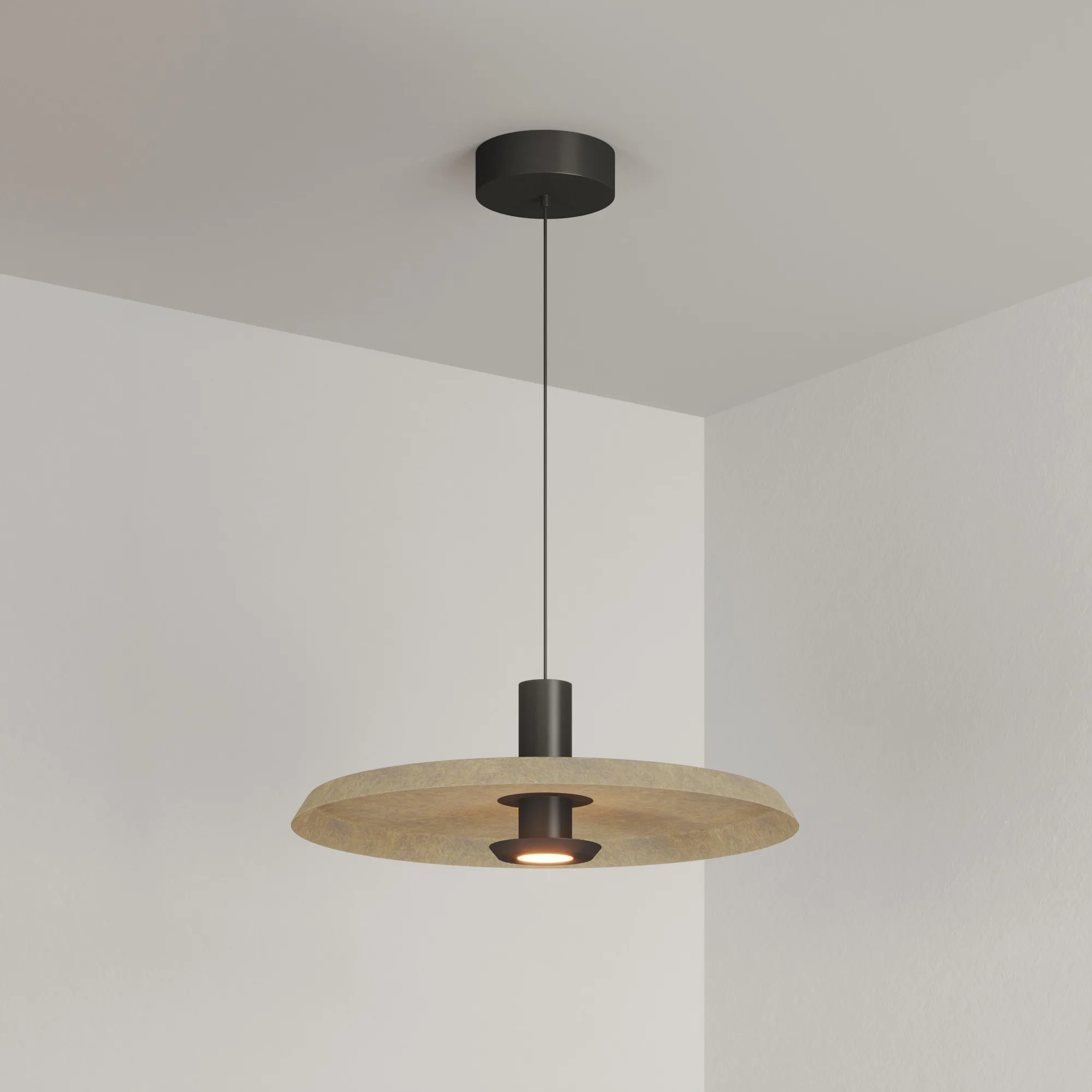Подвесной светильник. Мощность 12 Вт, св. поток 768 лм, 64 лм/Вт, теплый 3000 K, CRI>94, угол 36°, напряжение питания 230 В. Бежевый фигурный плафон из переработанного фетра с кофейной внутренней поверхностью, линза-рассеиватель из PMMA, степень защиты IP20. Размер: диаметр 450 мм, высота 145 мм. Монтаж подвесной, длина подвеса 2000 мм, регулируемая. В комплекте 2 вида чаш. Габариты чаши (встраиваемая) Ø80 х 23 мм, врезное отверстие Ø60 мм. Габариты чаши (накладная) Ø120 x 35 мм. Драйвер 59В, 300 мА, пульсация <1%. Управление по TRIAC.