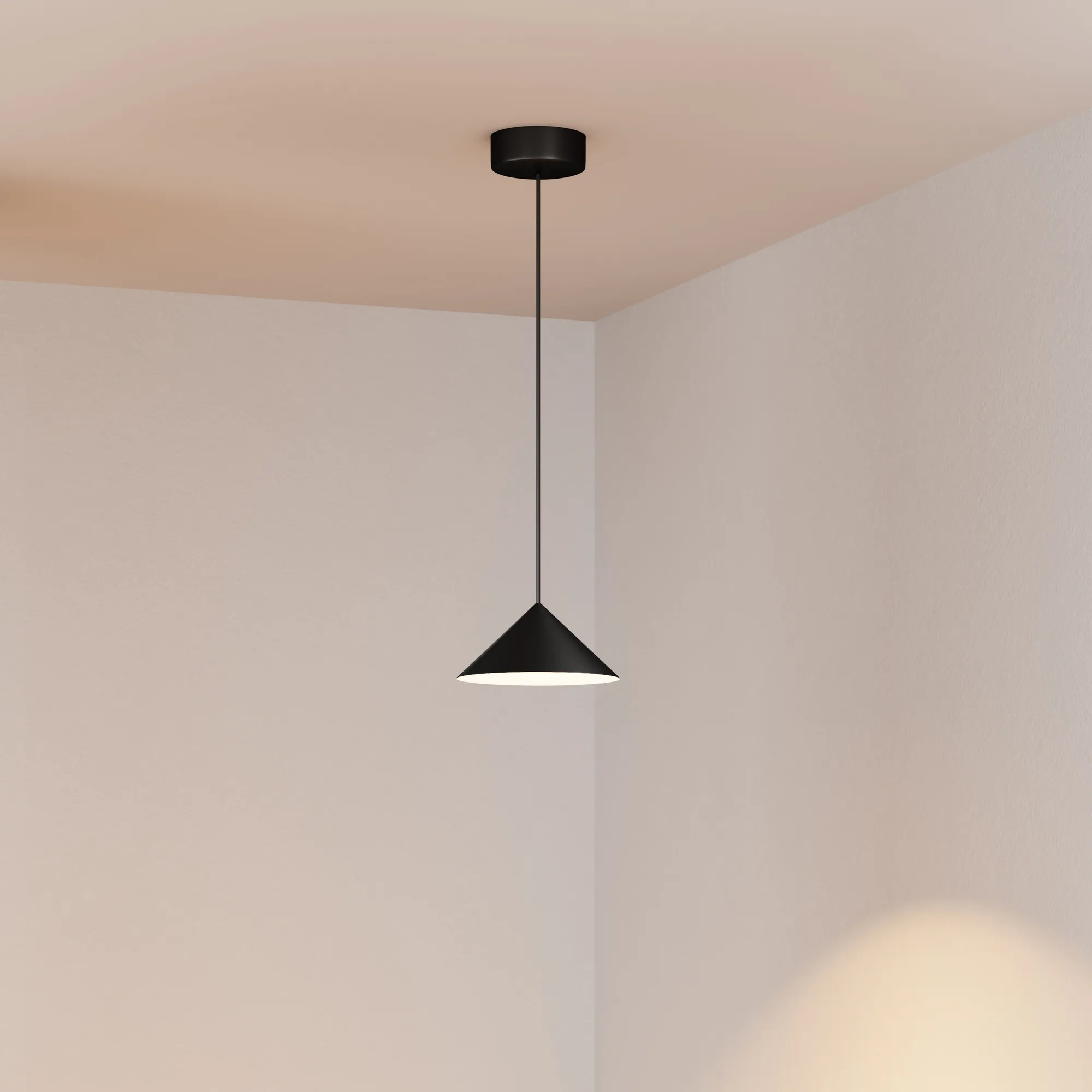 Подвесной светильник. Мощность 10 Вт, св. поток 650 лм, 65 лм/Вт, теплый 2700 K, CRI>94, угол 36°, напряжение питания 230 В. Черный корпус из алюминия в форме конуса с белой внутренней поверхностью, линза-рассеиватель из PMMA, степень защиты IP20. Размер: диаметр 240 мм, высота 110 мм. Монтаж подвесной, длина подвеса 2000 мм, регулируемая. В комплекте две чаши. Габариты чаши (встроенной) Ø80 х 41 мм, врезное отверстие Ø55 мм, габариты чаши (накладной) Ø110 х 25 мм. Драйвер 2,8-12В, 520 мА, пульсация <1%.Управление по TRIAC.