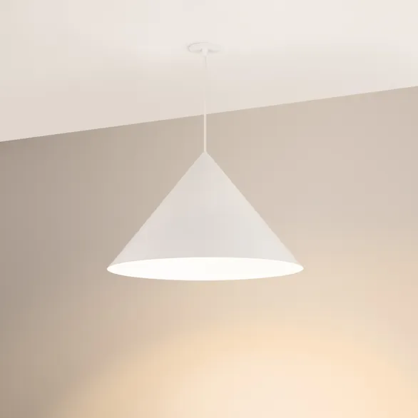 Подвесной светильник. Мощность 14 Вт, св. поток 1200 лм, 74 лм/Вт, тёплый 2700K, CRI>97, угол 36°, напряжение питания 230 В. Белый корпус из алюминия в форме конуса с белой внутренней поверхностью, линза-рассеиватель из PMMA, степень защиты IP20. Размер: диаметр 550 мм, высота 340 мм. Монтаж подвесной, длина подвеса 2000 мм, регулируемая. В комплекте 2 вида чаш. Габариты встраиваемой чаши: Ø 80x23 мм. Габариты накладной чаши Ø140x55 мм. Драйвер 27-42 В, 350 мА, пульсация <1%. Управление по TRIAC.