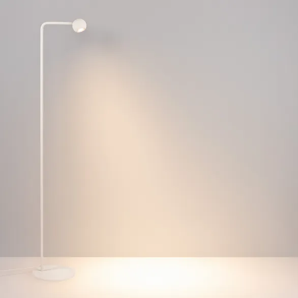 Декоративный напольный светильник. Мощность 6 Вт, св. поток 540 лм, 90 лм/Вт, теплый 3000К, CRI>90, угол 30°, напряжение питания 230 В. Белый корпус из алюминия (основание, ножка, светоизлучаль в форме шара), степень защиты IP20. Размер основания Ø210×11 мм, размер ножки Ø12,5×1220х160 мм, размер светоизлучателя Ø65×55,5 мм. Длина провода 1930 мм, питание от сети 220-240V. Пульсация < 1%.