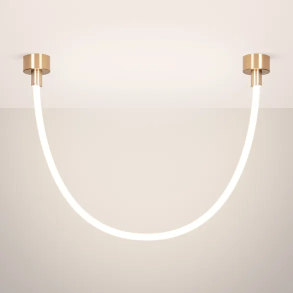 Подвесной светильник. Мощность 18 Вт, св. поток 980 лм, 54 лм/Вт, тёплый 3000 K, CRI>90, угол 360°, напряжение питания 230 В. Золотой круглый корпус из стали, силиконовая герметичная лента, степень защиты IP20. Размер: общая высота чаши 85 мм, высота чаши без вывода под неон 50 мм, диаметр вывода под неон 35 мм, диаметр чаши 130 мм, диаметр силиконовой герметичной ленты 18 мм, длина силиконовой герметичной ленты 1200 мм. Монтаж накладной. Блок питания 24 В, 750 мА, пульсация <5%.