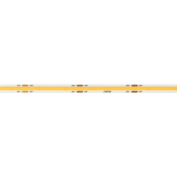 Светодиодная лента сплошного свечения COB серии X320 шириной 8 мм, мощностью 8 Вт/м. Напряжение питания 24 В. Светодиоды CSP, 320 шт/м, теплого цвета свечения (3000K). Высокий индекс цветопередачи CRI>90 обеспечивает точное восприятие цветовых оттенков при освещении любых жилых, офисных или производственных помещений. Минимальный отрезок 50 мм. В ленте используется технология ReelToReel, данная технология обеспечивает производство ленты без пайки и повышает ее механическую прочность. Эффект сплошной линии света создается без применения рассеивающих экранов. Используется для декоративной подсветки рекламных конструкций и витрин.