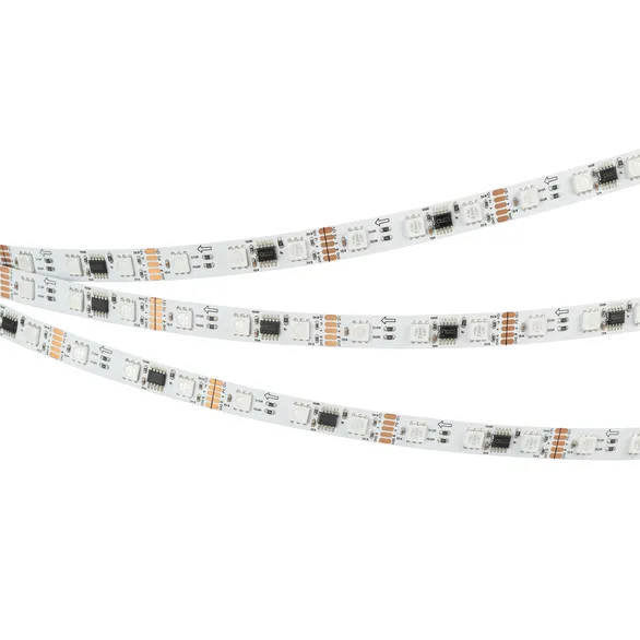 Светодиодная лента DMX серии B60 с микросхемой GS8526. Светодиоды SMD 5060, 60 шт/м, 20 pixels на 1 м (100 pixels на 5 м), 1 pixel = 3 светодиода, белая плата шириной 10 мм, скотч 3М. Цвет RGB, угол 120°. Питание 12 В, мощность 14 Вт/м (70 Вт на 5 м). Размеры 5000x10x2.2 мм. Мин. отрезок 50 мм, 3 светодиода. Цена за 1 м.