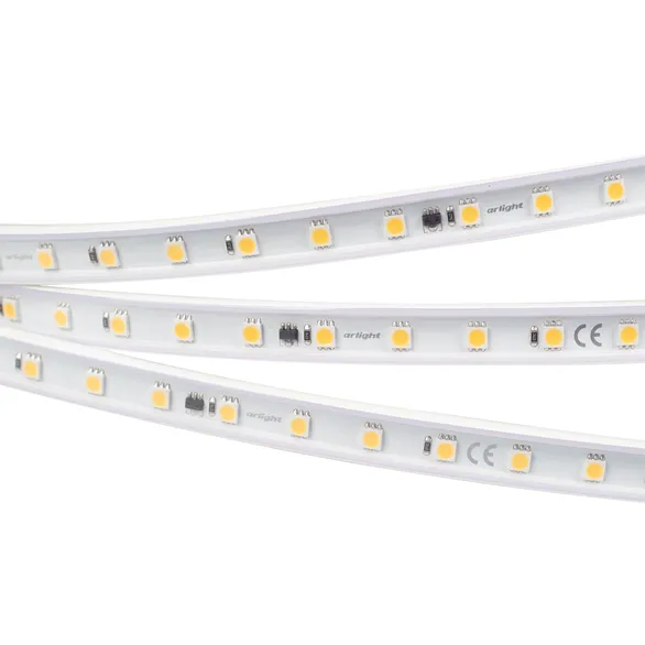 Светодиодная герметичная лента ARL серии B54, IP65 (PV - трубка, ПВХ экструзия). Светодиоды 5060, 54 шт/м, белая плата шириной 12 мм. Цвет ТЕПЛЫЙ 3000K, индекс цветопередачи CRI>90, угол 120°. Питание 230 В, мощность 8 Вт/м (80 Вт на 10 м). Размеры 10000x15.5x6 мм. Мин. отрезок 500 мм, 27 светодиодов. Цена за 1 м. Светодиодная лента крепится с помощью скоб (приобретаются отдельно), 3M скотч отсутствует. Катушка 10 м.