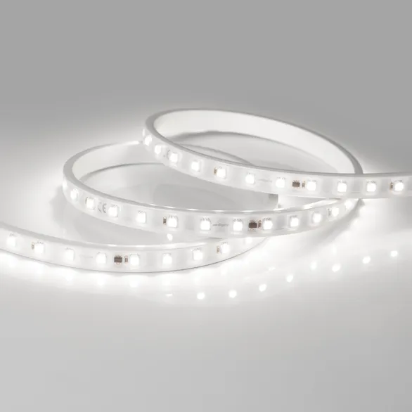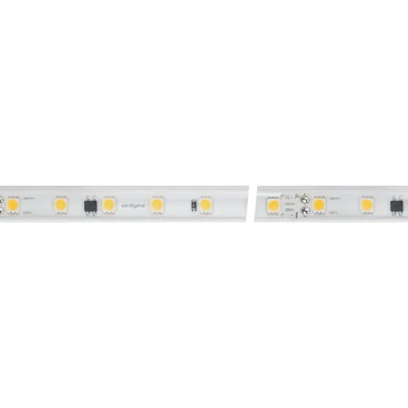 Светодиодная герметичная лента ARL серии B54 шириной 15.5 мм, мощностью 8 Вт/м, степень защиты IP65, в прозрачной ПВХ-трубке, оболочка ленты имеет защиту от УФ излучения, что позволяет использовать ее на улице. Светодиоды SMD 5060, 54 шт/м, белого цвета свечения (6000K). Высокий индекс цветопередачи CRI>90 обеспечивает точное восприятие цветовых оттенков. Лента подключается напрямую к сети переменного тока 230 В и не требует использования источников питания. Использование интегральных стабилизаторов тока позволяет подключать ленту длиной до 50м, обеспечивая при этом равномерную яркость свечения по всей длине ленты. При подключении нескольких лент, подавать питание на каждые 50м отдельным кабелем. Запрещается последовательное подключение лент более 50м. Предназначена для декоративной подсветки на улице и в помещениях, создания контуров рекламных объектов, подсветки потолочных ниш. На лентах установлены микросхемы с функцией снижения тока для защиты ленты от перегрева, что обеспечивает надежную работу лент в различных условиях. Диммирование осуществляется диммерами TRIAC в диапазоне 15%-90%. Крепление с помощью скоб, аксессуары для монтажа и подключения поставляются отдельно. Катушка 50 м.