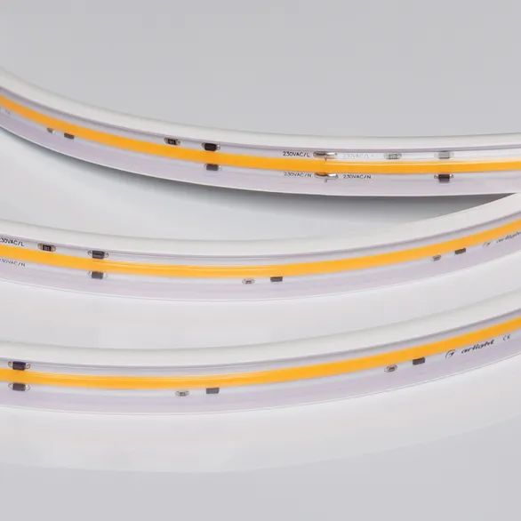 Светодиодная герметичная лента ARL сплошного свечения серии X720 со степенью защиты IP65, защитная оболочка из ПВХ устойчива к УФ излучению, что позволяет использовать ее на улице. Высокая плотность светодиодов X720 позволяет создать эффект сплошной идеальной линии света без применения рассеивающих экранов. Лента подключается непосредственно к сети переменного тока 230 В и не требует использования источников питания. Наличие интегральных стабилизаторов тока позволяет подключать ленту длиной до 30 м, обеспечивая при этом равномерную яркость свечения по всей длине ленты. При подключении нескольких лент необходимо подавать питание на каждые 30 м отдельным кабелем, последовательное подключение лент более 30 м запрещается. Лента применяется для подсветки потолочных ниш, декоративной подсветки, создания контуров рекламных объектов, может использоваться в помещениях и на улице. На лентах установлены микросхемы с функцией снижения тока для защиты ленты от перегрева, обеспечивающие надежную работу в различных условиях. Диммирование осуществляется диммерами TRIAC в диапазоне 30%-90%. Крепление с помощью скоб, аксессуары для монтажа и подключения поставляются отдельно. Поставка под заказ от 120 м.