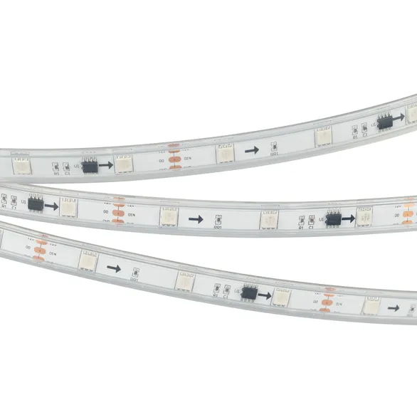 Светодиодная герметичная лента SPI серии B30 с микросхемой 16703, IP66 (P - силиконовая трубка). Светодиоды SMD 5060, 30 шт/м, 10 pixels на 1 м (50 pixels на 5 м), 1 pixel = 3 светодиода, белая плата шириной 10 мм, скотч 3M. Цвет RGB, угол 120°. Питание 12 В, мощность 7.2 Вт/м (36 Вт на 5 м). Размеры 5000x12x4.5 мм. Мин. отрезок 100 мм, 3 светодиода. Цена за 1 м.